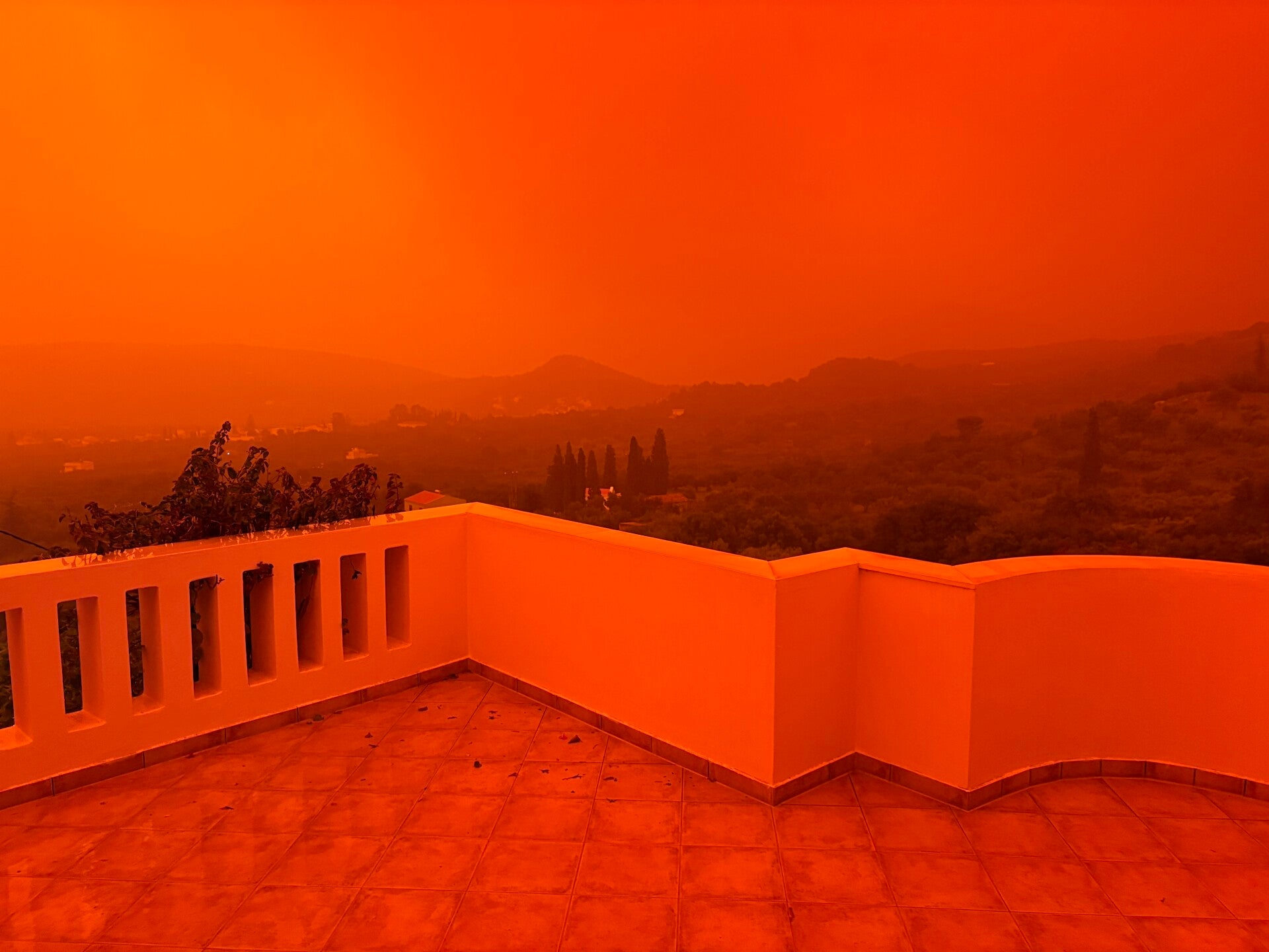 Nicht so hier, wie die beiden Bilder dokumentieren!!! Das linke Photo (September 2019), es zeigt wie das Tal normalerweise aussieht. Rechts die Aufnahme ist vom 22.März 2018 und technisch unverändert, nur "jpg" konvertiert. Wir waren gerade auf der Heimfahrt von Agios Nikolaos als die Luft sich immer mehr in braun-orange verfärbte. Zu Hause angekommen, ca. 10 Min. später machte ich das Saharsand-Photo!!